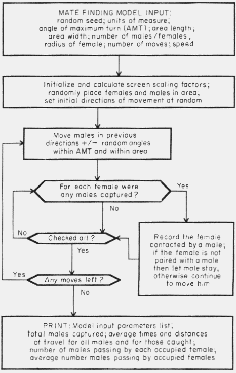 Figure 1. Flow diagram of computer program of simulation model of mate finding