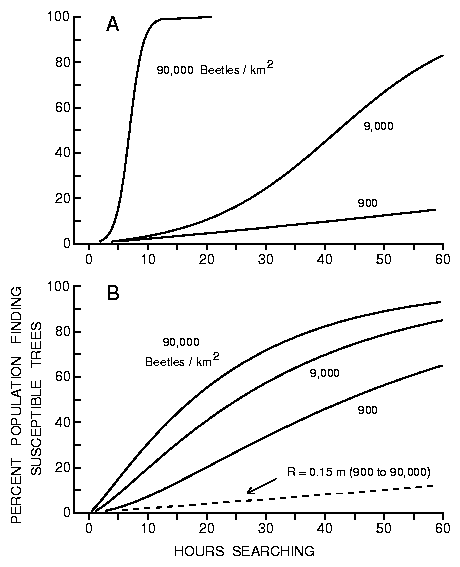 through time depends on the number of searching animals (bark beetles), number