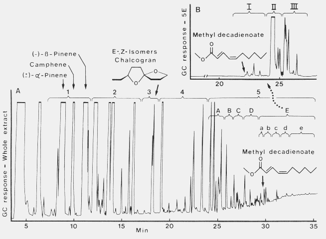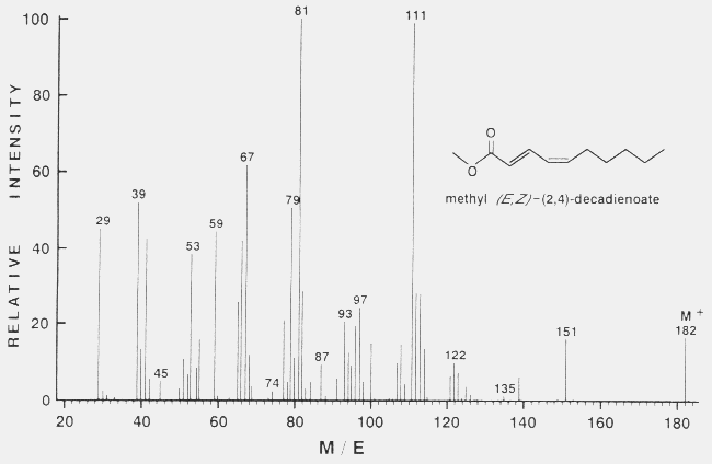 Polar GC column 1: Fused silica; length = 46 m, ID = 0.35 mm; OV-351, df = 0.59 wm. Temperature program: 50o C for 5 min, 5oC/min to 200oC, then isothermal for 20 min. Preparative GC: Instrument: Carlo Erba, model 4160. Polar GC column 2: Fused silica; length = 24 m, ID = 0.35 mm; OV-351, df = 0.5 µm. Temperature program: 5OoC for 2 min, 5oC/min to 220oC, then isothermal for 20 min. Mobile phase: N2 at 30 cm/sec. Nonpolar GC column 3: Fused silica; length = 26 m, ID = 0.32 mm; SE-33 cross-linked, df = 0.5 µm. Temperature program: 80oC for 2 min, 5oC/min to 220oC, then isothermal for 20 min. Mobile phase: N2 at 30 cm/sec. Analytical GC-MS: Instrument: Finnigan, model 402l. Polar GC column 4: Fused silica; length = 23 m, ID = 0.20 mm; OV-35l, df = 0.5 µm. Temperature program: 50oC for 4 min, 8oC/min to 200oC, then isothermal for 10 min. Mobile phase: He at 20 cm/sec. Nonpolar GC column 5: Fused silica; length = 12.5 m, ID = 0.20 mm; SE-54 cross-linked. Temperature program: 80oC for 3 min, 5oC/min to 220oC, then isothermal for 10 min. Mobile phase: He at 20 cm/sec. Quantitative GC-MS: Instrument: Finnigan. model 4021. Polar GC column 6: Fused silica; length = 25 m, ID = 0.15 mm; Superox FA, df = 0.3 µm. Temperature program: 50oC for 4 min, 8oC/min to 200oC, then isothermal for 10 min. Mobile phase: He at 20 cm/sec. |
