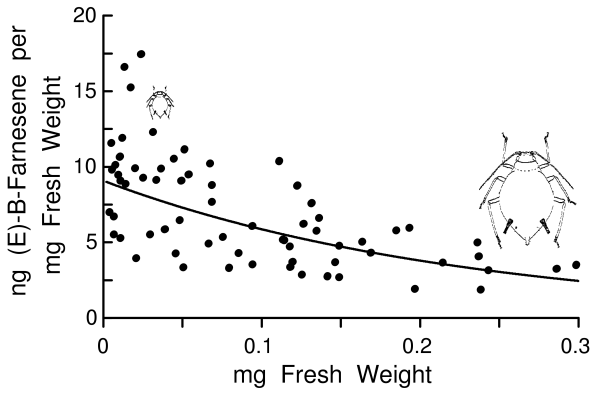 The sesquiterpene, (E)-B-farnesene, is used by many aphid species as an alarm pheromone to warn related individuals of predation. Disturbed cotton aphids, Aphis gossypii Glover, released (E)-B-farnesene into the air as detected by SPME (solid phase microextraction) and gas chromatography mass spectrometry (GC-MS). Solvent extracts of cotton aphids of various life stages and weights also were analyzed by GC-MS for sums of ions 69 and 93, which discriminated (E)-B-farnesene from coeluting compounds. Aphids of all life stages and sizes reared on cotton plants in both an environmental chamber and glasshouse contained (E)-B-farnesene in amounts ranging from 0.1 to 1.5 ng per individual. The quantities of (E)-B-farnesene in aphids increased in relation to increasing body weight, and variation in individual weights explained about 82% of the variation in alarm pheromone. However, the concentrations (ng/mg fresh weight) declined exponentially with increasing body weight. These findings indicate that aphid nymphs try to compensate by producing relatively more pheromone per weight than adults but still cannot approach an evolutionary optimal load, as assumed in adults with the greatest total amounts. This suggests that young aphids need to balance costs of growth and maturation with costs of producing the alarm pheromone.