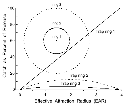 | Ring radius (m)a | Recapture % | EAR (95% C.L.)b | Recapture % | EAR (95% C.L.) |