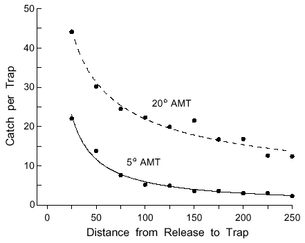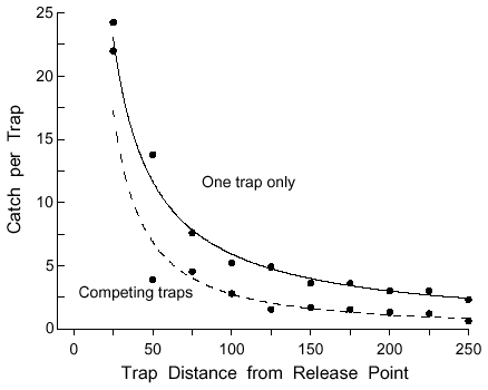 | Table 4. Estimated effective attraction radii (EAR in m) of traps with natural pheromone of Ips paraconfusus (75 males in logs) for nine experiments of various trap ring radius in order to obtain the observed catches (Gara, 1963). | ||||
