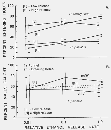 Fig. 4. A. Percentage of Hylurgops palliatus and Rhizophagus ferrugineus entering holes in