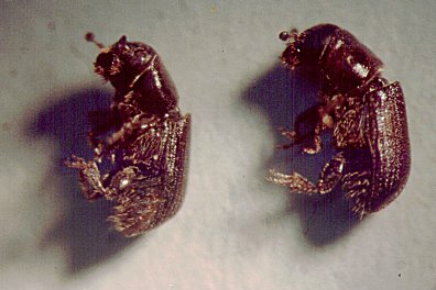 Male (left) and female (right) D. brevicomis. Female has a "collar" or mycangium which contains