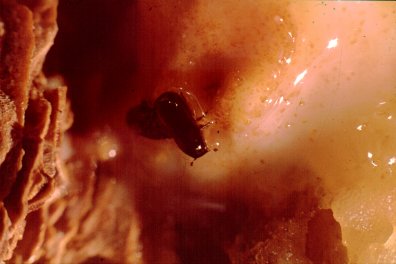 A mating pair of western pine beetles, Dendroctonus brevicomis, swimming in oleoresin of