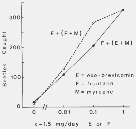 | Table 1. Catches of male and female Dendroctonus brevicomis (and sex ratios) and Temnochila chlorodia on sticky traps releasing various ratios of ethanol (A), frontalin (F), exo-brevicomin (E), and myrcene (M). | |||||