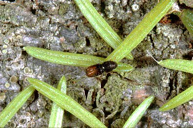 looking for place to begin boring into bark of Norway spruce, Picea abies. Only males produce