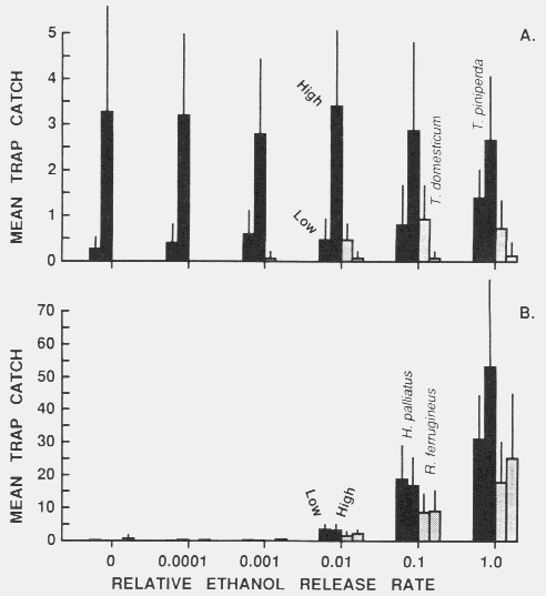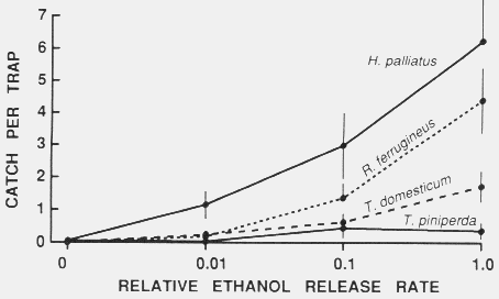 pipe traps with funnels that released monoterpenes (terpinolene, (+)-3-carene, and (+)- and (-)-alpha-pinene)