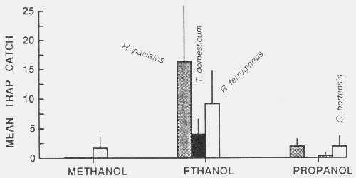 confidence limits (n=9). Traps with either butanol, pentanol, hexanol, ethylene glycol, or unbaited caught
